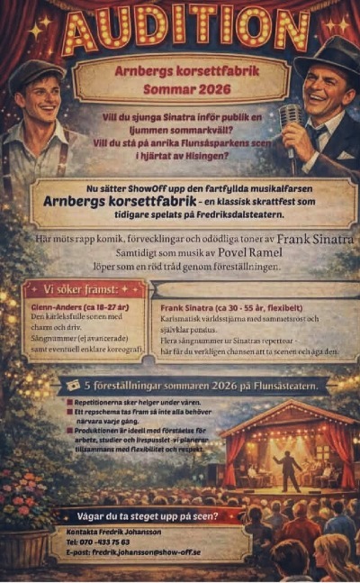 Sommaren 2026 sätter Show-Off upp musikalfarsen 'Arnbergs korsettfabrik'.